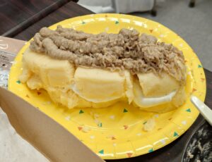 スタッフの指示通り生地を作り、栗を粉々にして生クリームと混ぜてオリジナルのマロンクリームを作りました!